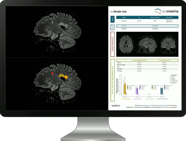 In clinical practice, regular magnetic resonance imaging (MRI) is the only established tool for DMT efficacy monitoring. However, detecting the often subtle changes by inspecting MRI scans is time consuming, tiring and therefore error-prone. icobrain ms is a validated AI technology enabling quantification of MRI datasets, summarising findings in a structured electronic report as well as annotated images highlighting areas of change that help guide assessment. icobrain ms complements visual assessment of MRI scans and helps the clinician to decide whether or not a change in DMT is warranted.